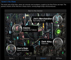 Sector 3 is the slums Sector of The Hive. It contains links to most of the Entertainment aspects of the game, such as, The Casino. Those links are: