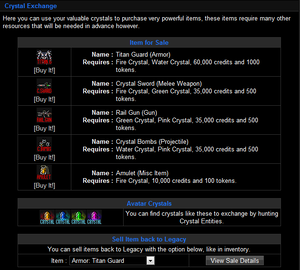 The Crystal Exchange is another way for avatars to gain an edge. By using turns, tokens, and crystals, an avatar can create godlike equipment and further boost his stats. This used to be called Item crafting but an update later changed this.
