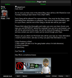 LegCon was first called WasteCon and it was first started by Deeg, it's first purpose was to give players a voice to Zorg on systems that really needed editing to make it more fair for players. Warfare was the main topic, due to the bans of players for Warfare Point farming and a lot of controversy over certain elements of the Wastelands being abused Deeg set-up monthly meetings in Online Chat and each gang could raise their point on all of the issues. Then a solution to the problems would be found, for example being able to leave a square with enemy gangs on. After the meetings Zorg reviewed the situations and edited systems appropriately, he added a time limit for when you step onto a square with enemy's. In 2009 Scott was appointed to Development Manager, he restarted WasteCon but renamed it LegCon because of the mass amount of topics that needed to be discussed. It became more about Legacy and less about Warfare. It was clear however these would be one every few months to make it an event and not a regular thing.