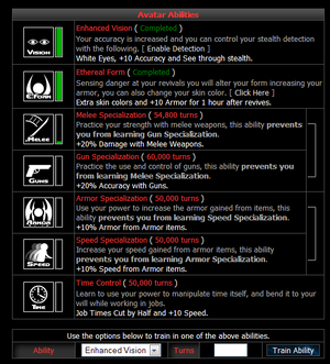Special abilities included Time Control (half job times) and Enhanced Vision (white eyes, see through stealth). In addition to this, avatars could choose to specialize in one weapon type (Melee or Gun) and specialization in either Speed or Armor.